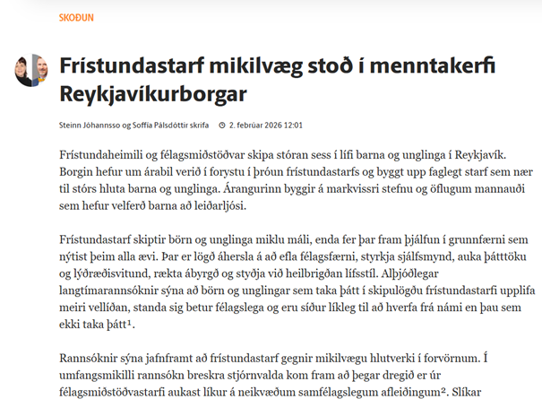 Frístundastarf mikilvæg stoð í menntakerfi borgarinnar. Eftir Soffíu Pálsdóttir, skrifstofustjóra og Stein Jóhansson, sviðsstjóra á Skóla og frístundasviði Reykjavíkurborgar